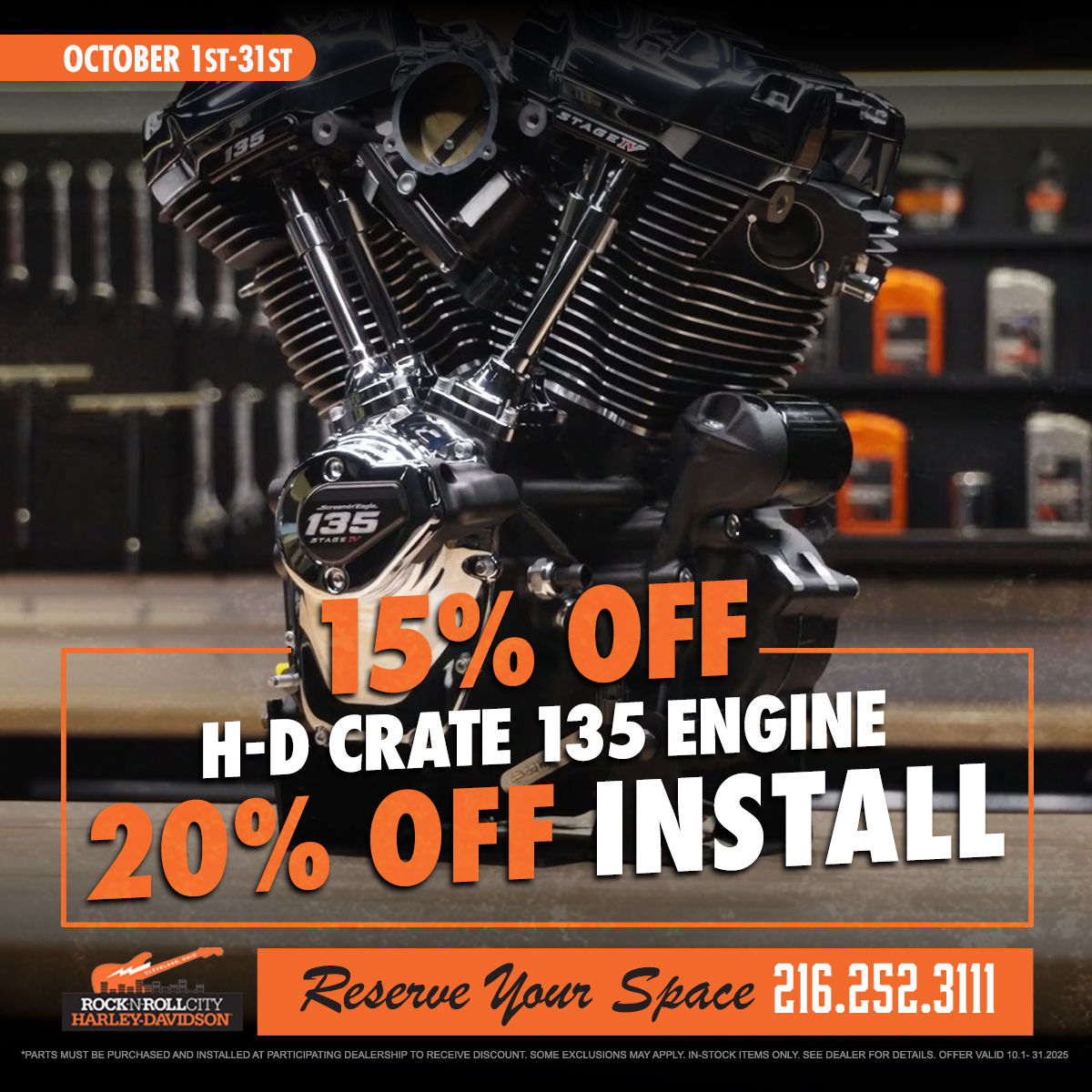 Upgrade your ride this October! Get 15% off the H-D Crate 135 Engine and 20% off installation at Rock n Roll City Harley-Davidson. Don’t wait—reserve your space today.
