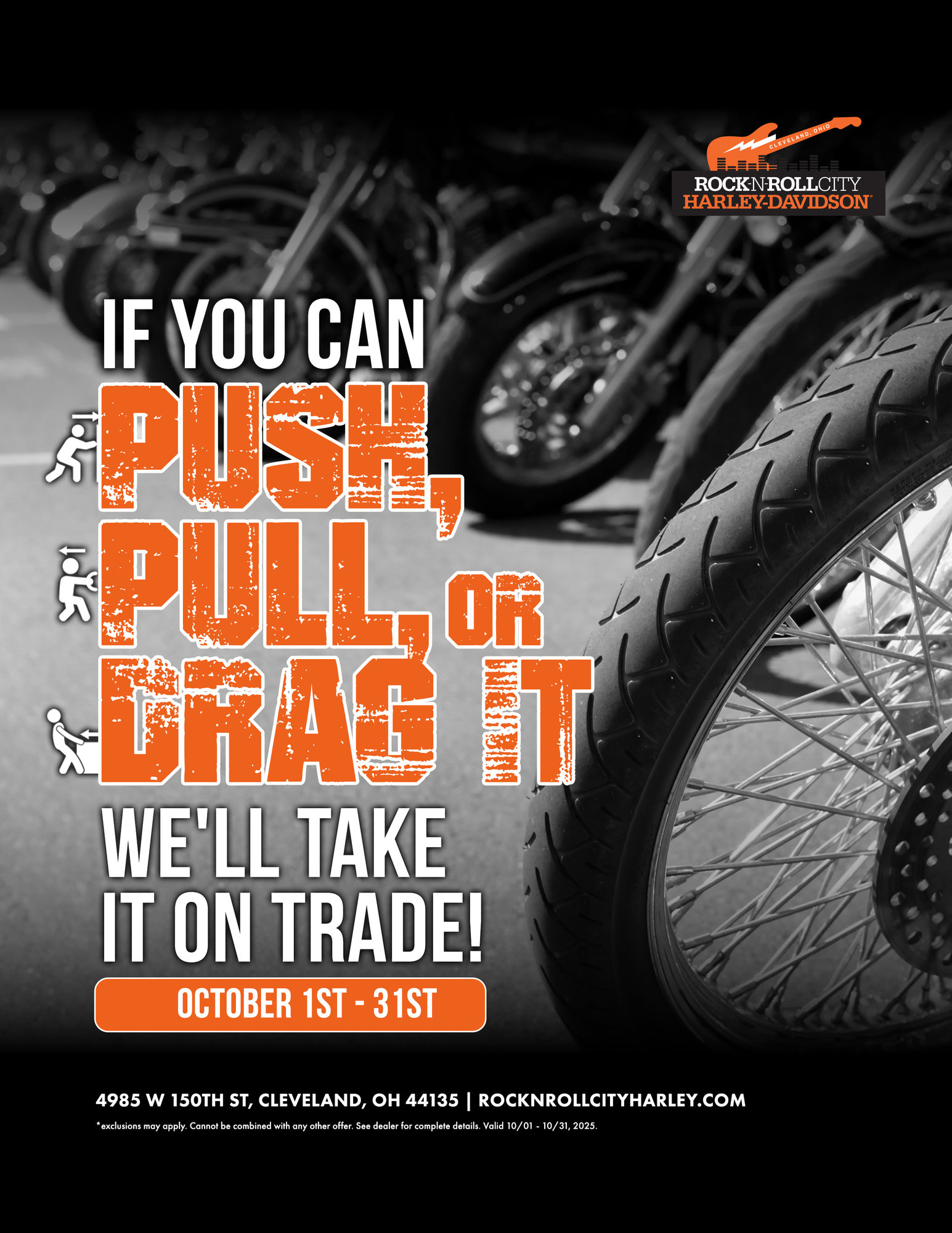 Push it, pull it, or drag it in—Rock n Roll City Harley-Davidson will take it on trade this October! No matter what shape it’s in, we’ll make it count. Offer valid October 1st–31st.