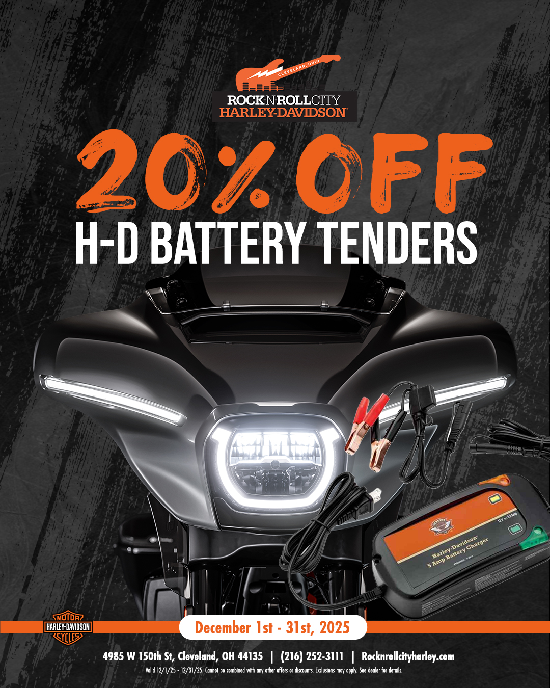 Cold temps won’t stop your ride. Keep your battery charged and ready all winter long with 20% off H-D Battery Tenders—now through the end of the month.