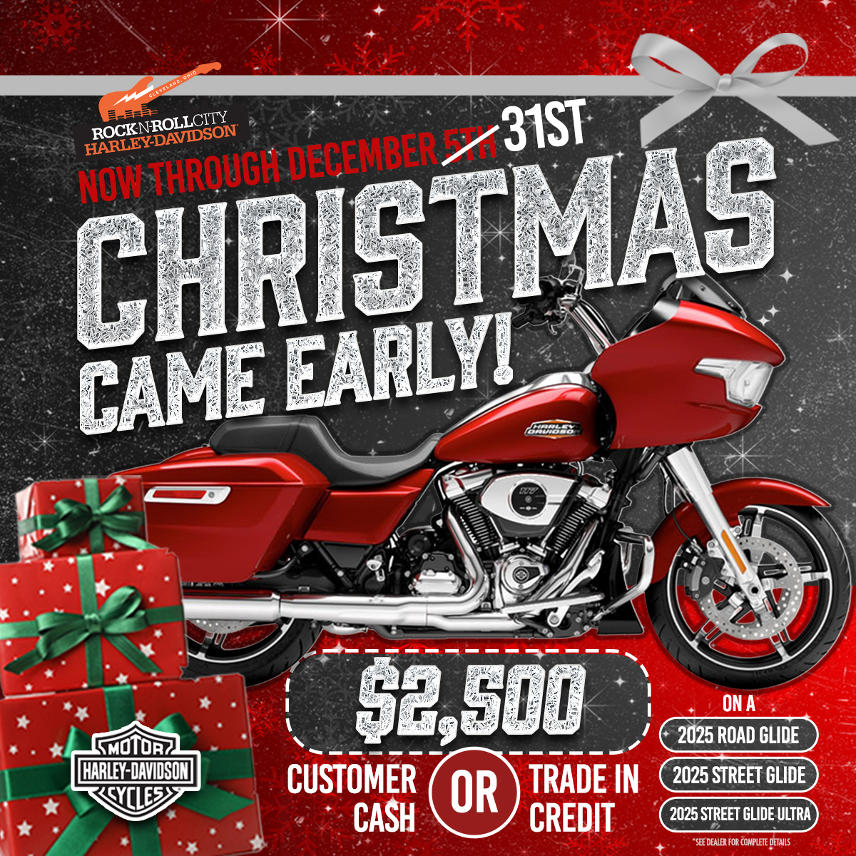 The holidays came early! Now through December 5th, receive $2,500 Customer Cash OR Trade In Credit on a 2025 Road Glide, 2025 Street Glide, or a 2025 Street Glide Ultra.