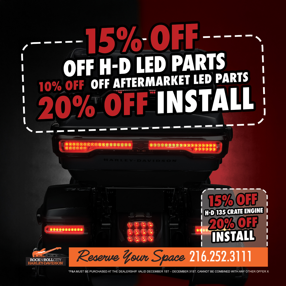 Light up the road with confidence. Enjoy 15% off H-D LED parts, 10% off aftermarket LED parts, and 20% off install—limited time only. Book your upgrade today.