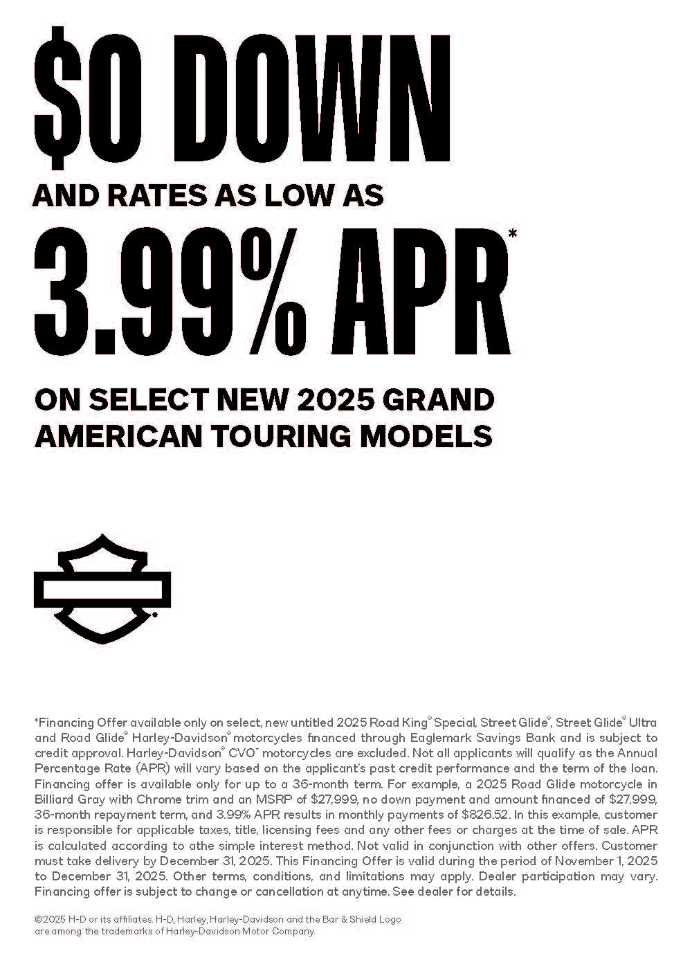 For a limited time, qualified buyers can ride a new 2025 Grand American Touring model with $0 Down + 3.99% APR. Offer ends December 31.
